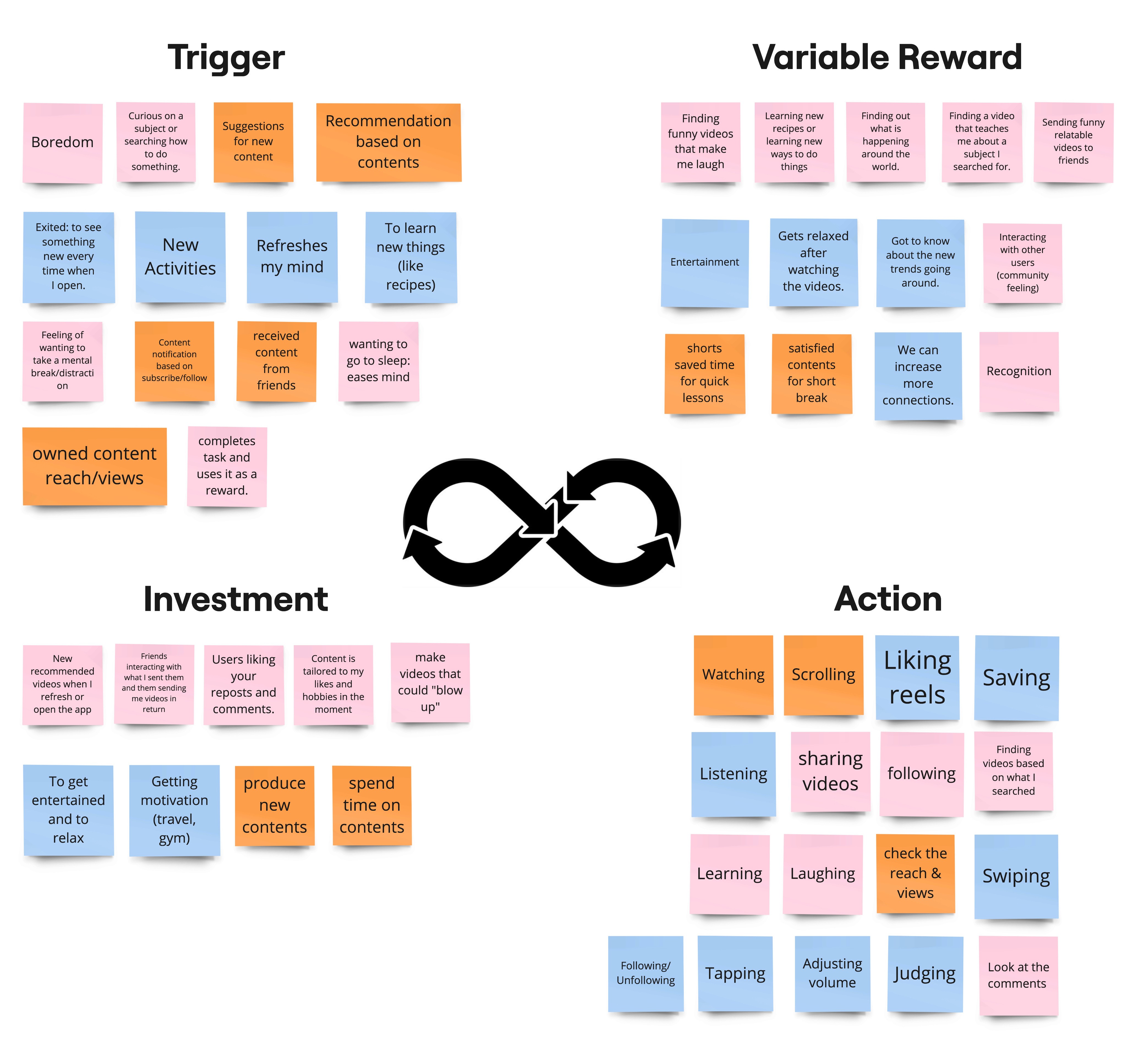I applied the Hooked Model (Trigger, Action, Variable Reward, and Investment) to design a habit-forming app. Collaborating with peers, we analyzed common behaviors in similar apps and created an affinity map to connect these stages. This helped shape the app’s design to drive user engagement and long-term habit formation.
