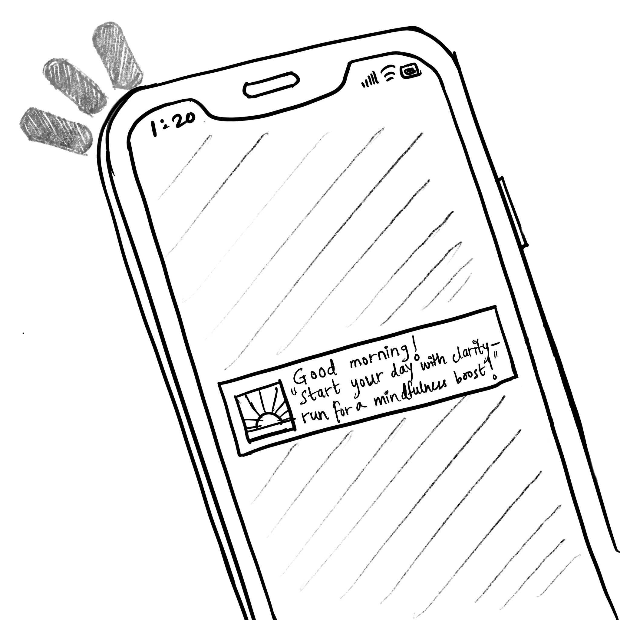 A smartphone screen lights up in the morning with a notification from Dawn Dash to get up and start running.