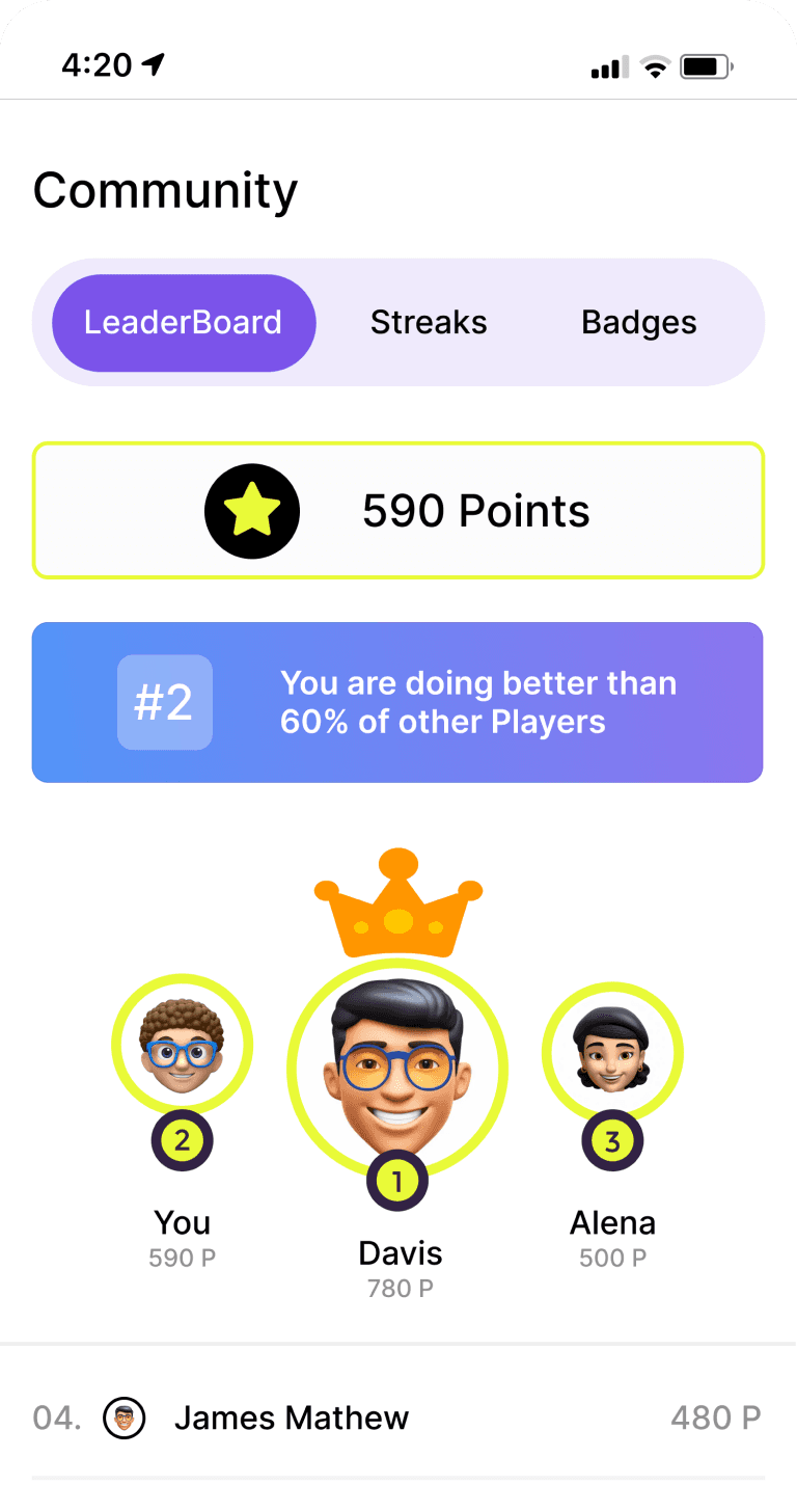 The app displays a leaderboard with the streaks, awarding her for finishing first in the community by covering more kms than other people on her first day.