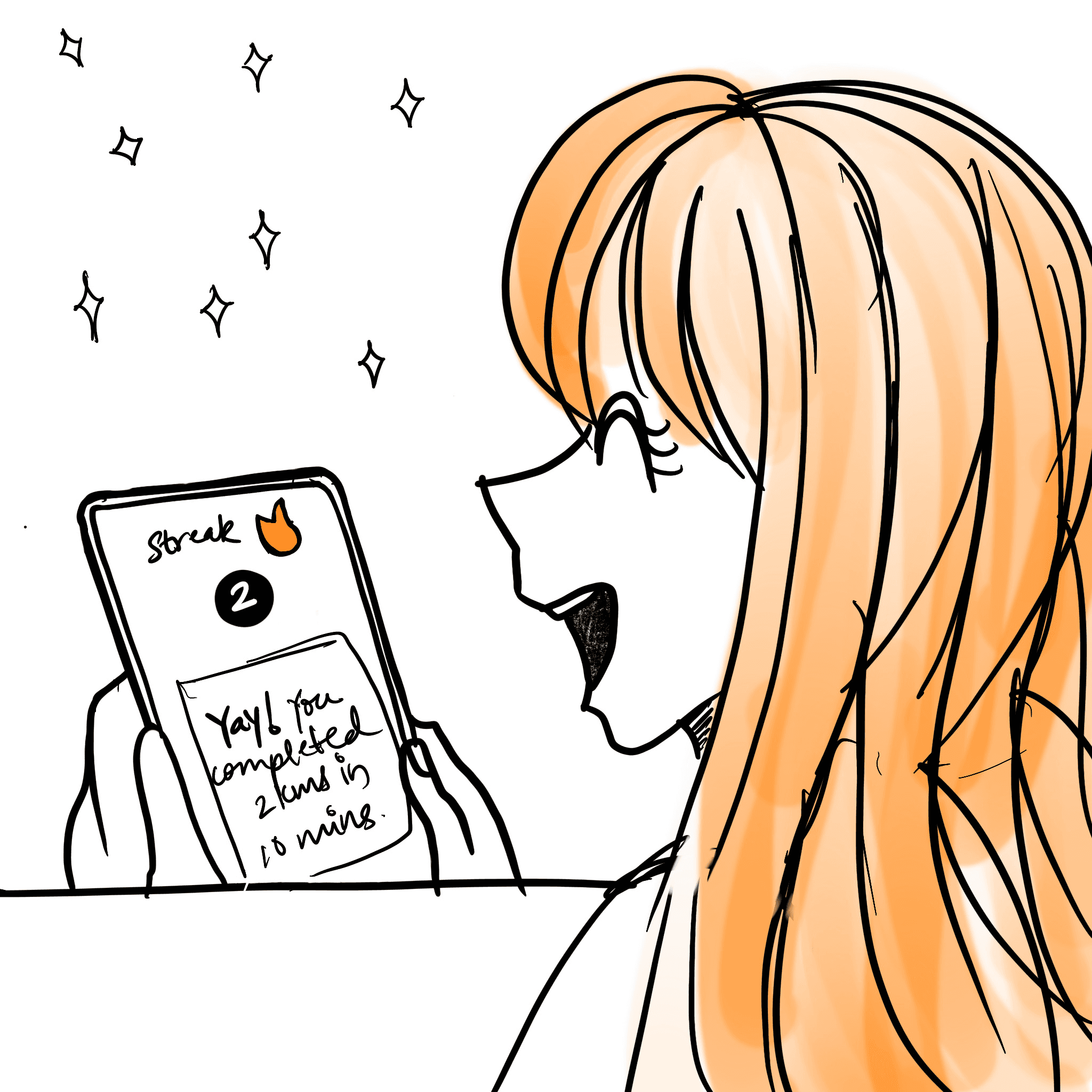 Eva gets a message that she ran 2 kms in 10 mins in todays run with the streaks.