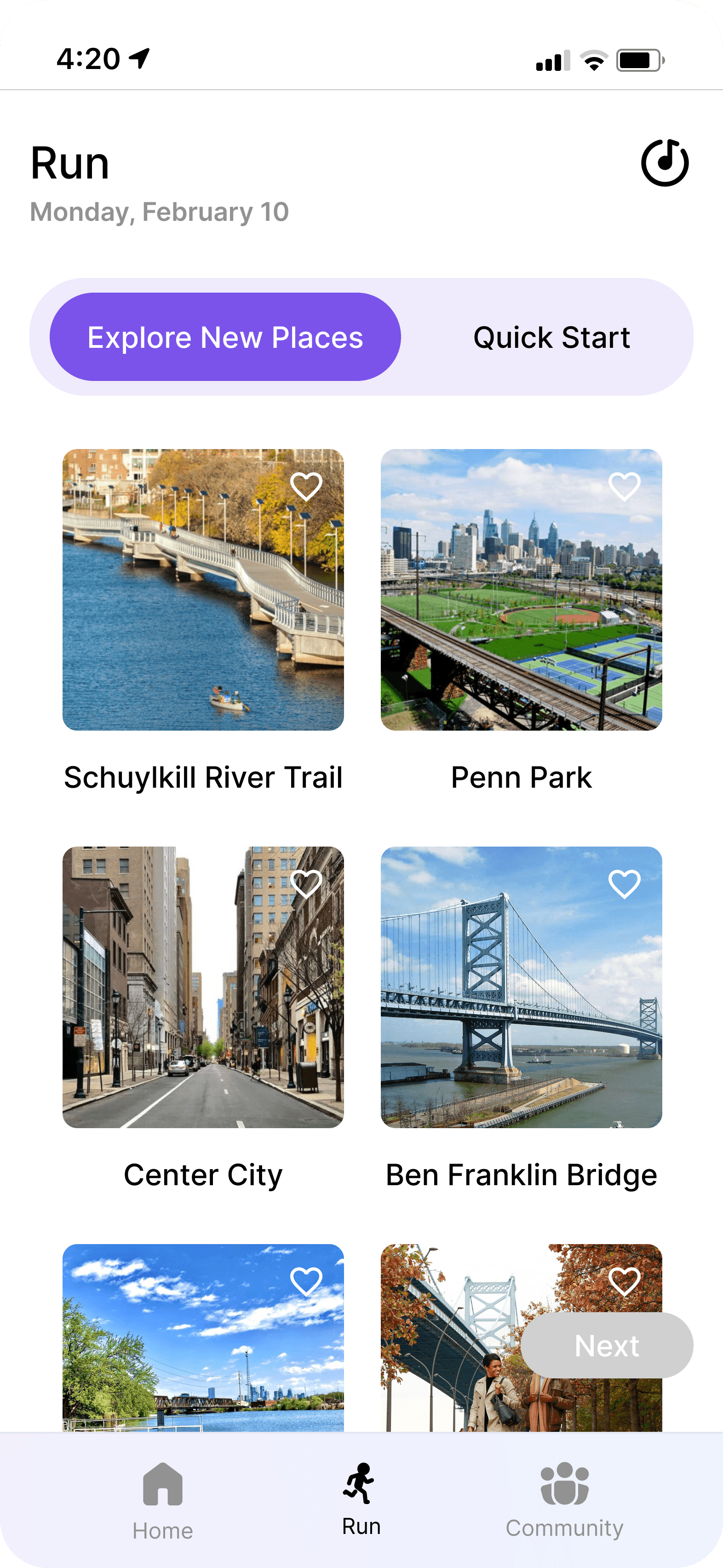 When she clicks on the notification, the app’s home screen displays nearby scenic places with highlights of the people where they upload their photos of the run.