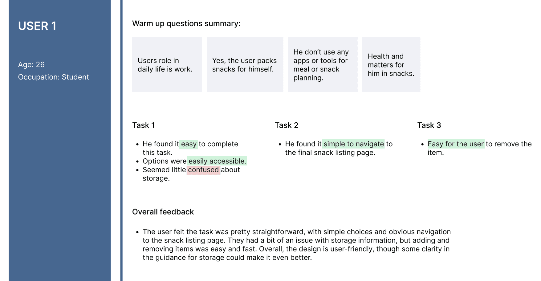 User testing showed that the snack selection feature was easy to navigate, with accessible options. I took 5 interview and got this insights: