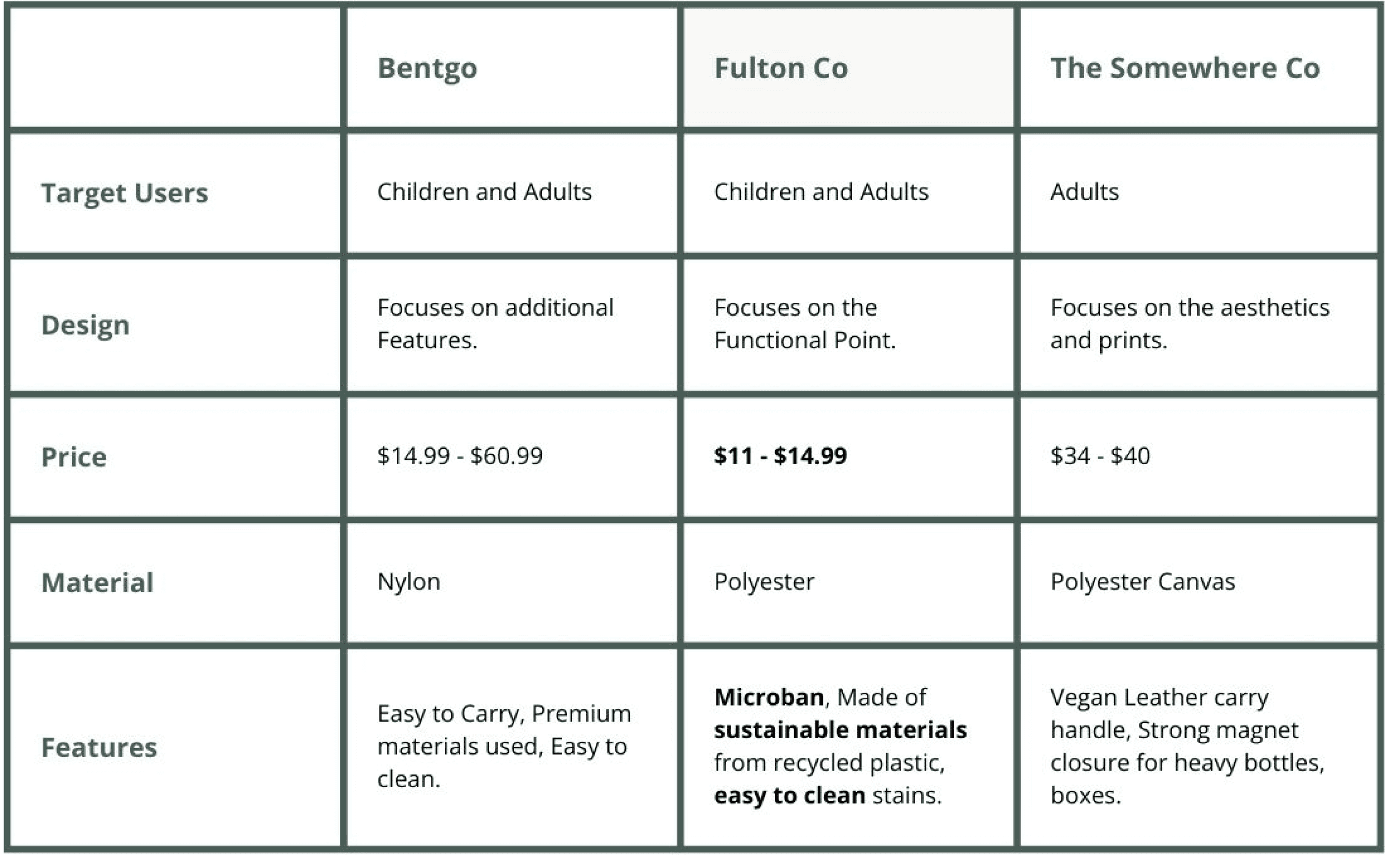 To understand the market positioning of Fulton Bags, I conducted a competitive analysis comparing key players like Bentgo and The Somewhere Co. The analysis focused on target users, design approach, pricing, materials, and unique features. Fulton Bags stands out for its affordability and functional design, using sustainable materials. This insight helped identify opportunities for e-commerce integration.