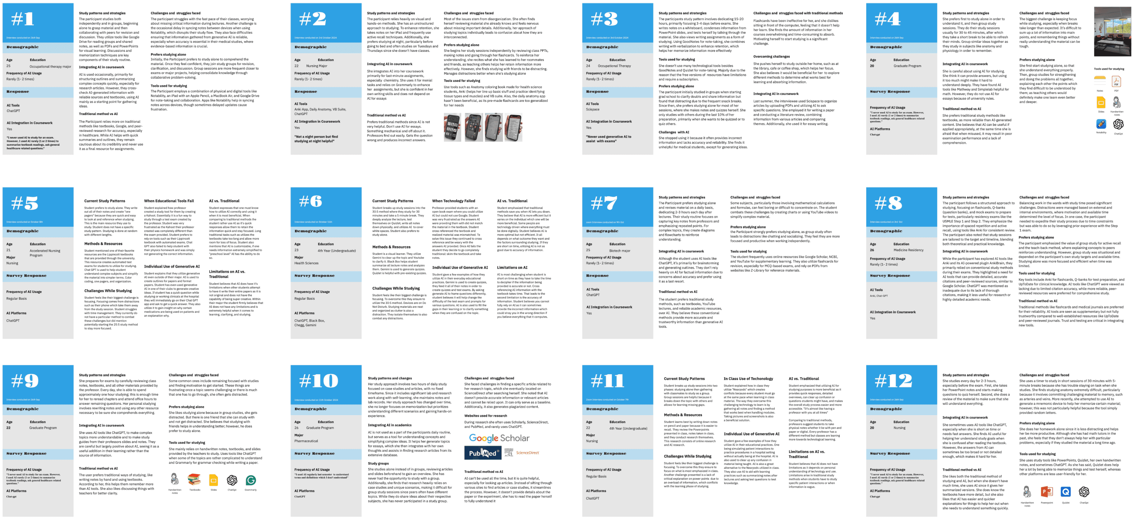 To better understand the pain points and advantages of using Gen AI, we conducted 12 interviews with pharmacy students. Each interview was thoroughly debriefed and systematically organized into individual boards, highlighting the user's benefits, challenges, expectations, and quotes. We then synthesized this information into key takeaways, needs, pain points, and goals, allowing us to identify where problems and advantages overlapped among participants and ultimately guide us toward finding effective solutions.