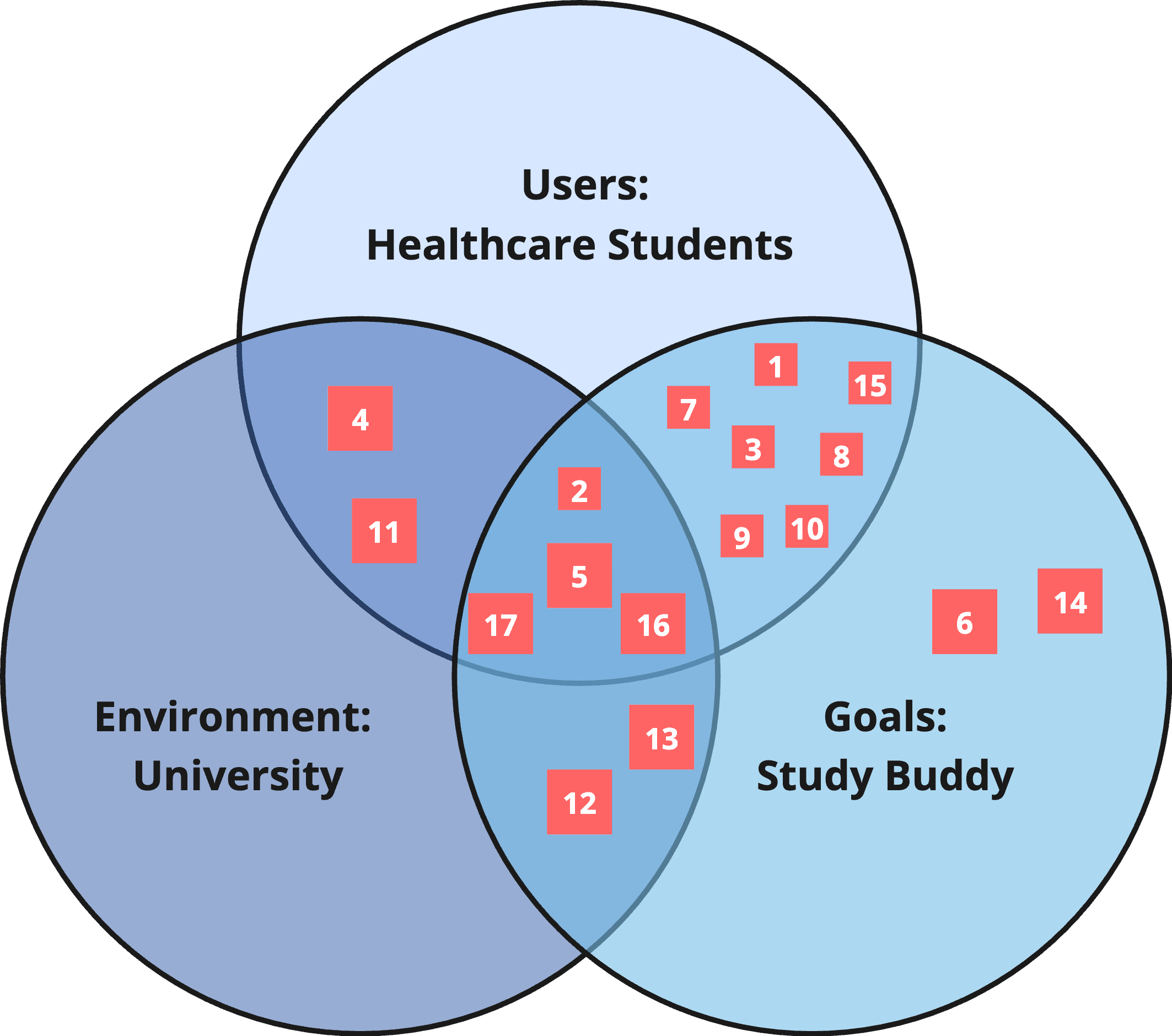 We began by creating a Venn diagram to pinpoint where our goals, target audience, and environment intersected in order to clarify our objectives and focus our research on the key areas of overlap.