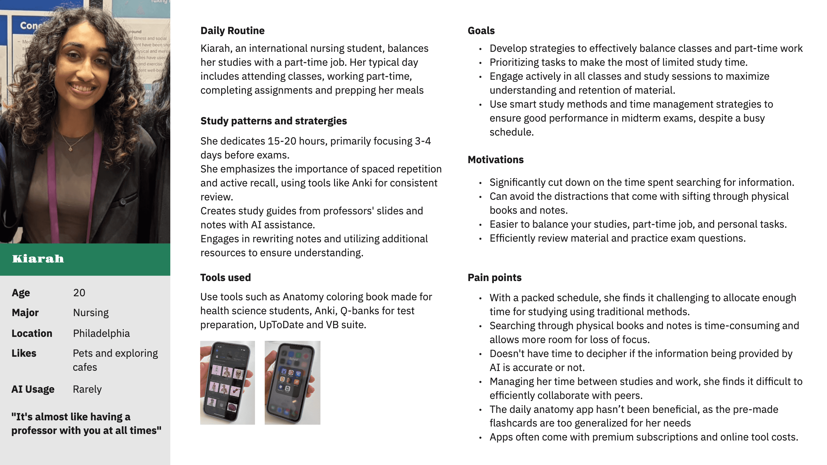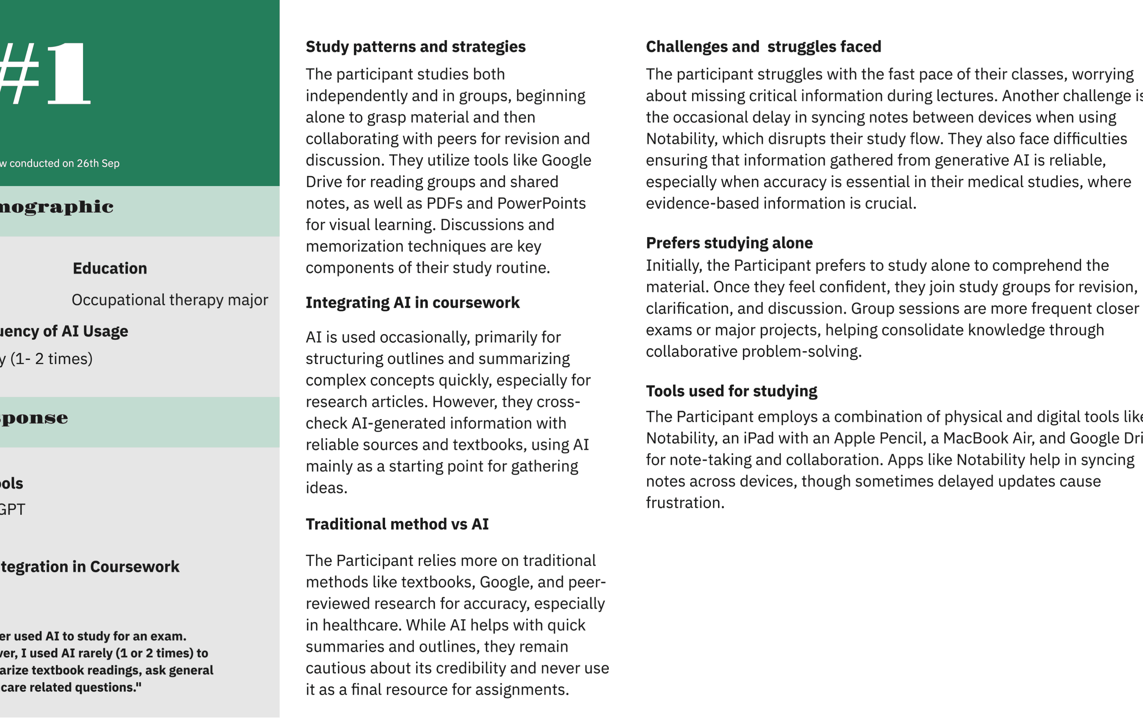 From our desk research and 12 in-depth user interviews (supported by recordings and transcripts), it became clear that healthcare students see potential in using AI to handle their demanding workloads. Despite this interest, trust remains low. Students value the convenience generative AI provides, yet all participants emphasized the need to verify its outputs, citing concerns over accuracy and insufficient detail.