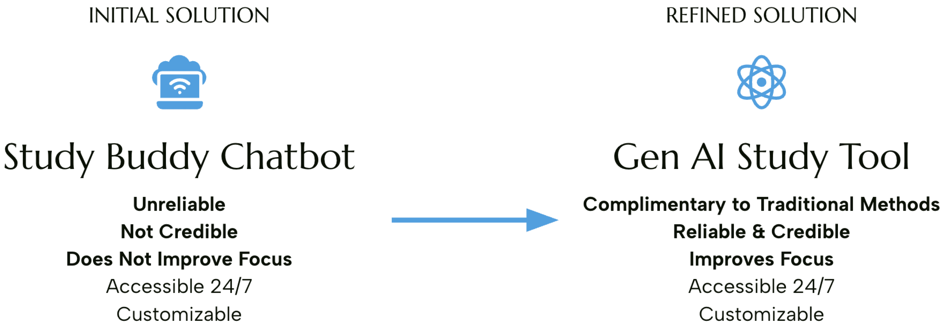 Through our research, we refined our initial concept of Gen AI as a study buddy chatbot. We refined its role, shifting from an interactive companion o a supplemental tool that enhances learning.